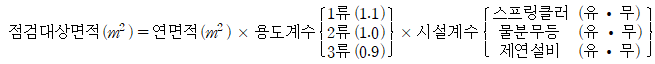 - 점검대상면적을 8,000㎡(작동 10,000㎡)로 나누어 정수로 나온 점검일자는 A값을 곱하여 적용하며, 정수 이하의 나머지 면적은